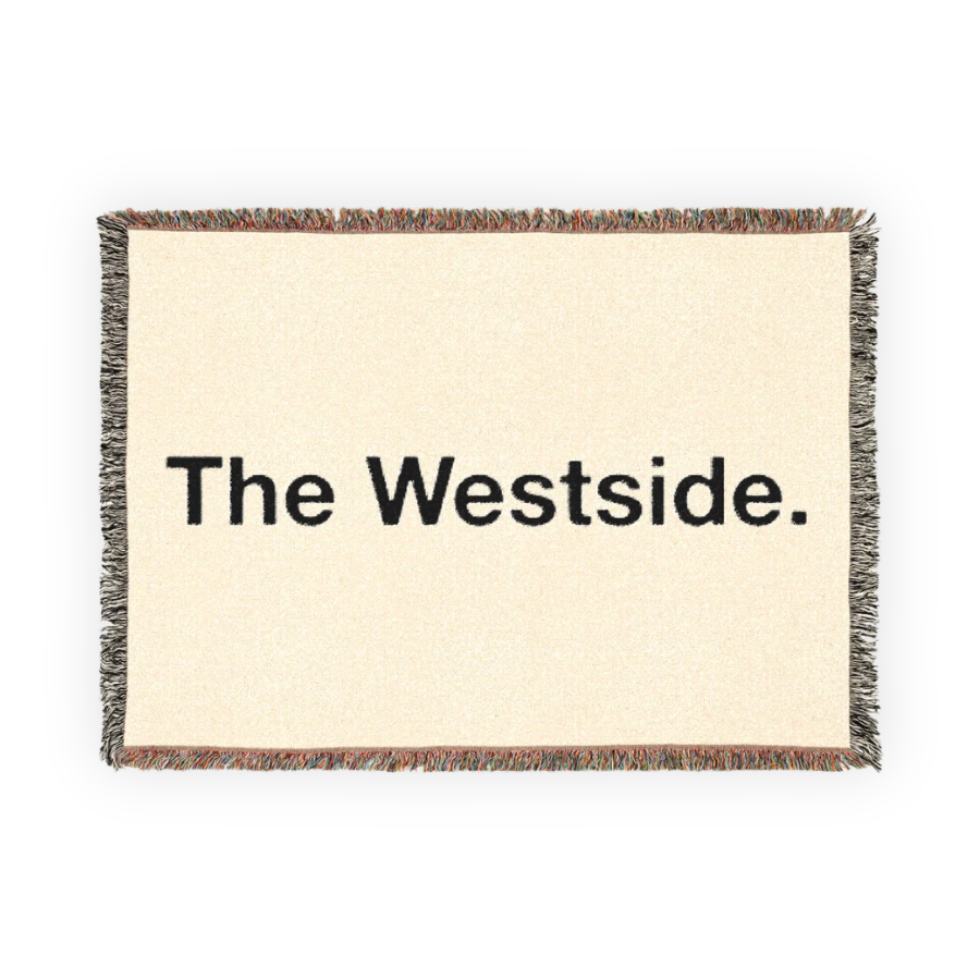 This blanket is made from 100 percent cotton in a natural cream color, with The Westside in black, woven directly into the fabric. Sized at 52 by 37 inches, it works as a throw on the couch, folded at the foot of a bed, or hung on a wall. The weave has a noticeable weight and texture, and the multicolor fringe adds a subtle pop without overwhelming the space. It’s cozy, well made, and designed to live out in the open.